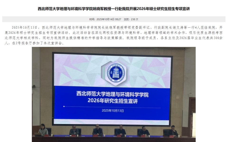 图3.邀请西北师范大学地环学院院长来校作考研政策解读