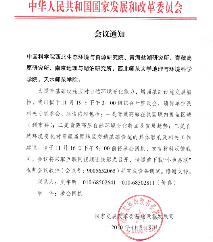 受国家发改委基础司的邀请,11月19日tyc8722太阳集团城博士刘宝康通过在线视频方式参加了由国家发改委基础司组织召开的青藏高原自然环境变化对青藏高原地区交通基础设施影响的专家座谈会。这是刘宝康博士继2019年2月赴北京参加由国家发改委基础司组织召开的可可西里盐湖水患问题专家座谈会以来,再次受邀参加由国家发改委牵头组织的专家座谈会。