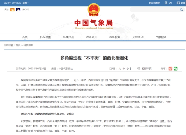 气候变化不仅影响人类生存环境,也将影响世界经济和社会进步。在全球变暖背景下,深入研究我国西北地区气候暖湿化趋势,对于理解北半球中高纬干旱半干旱区对全球气候变暖的响应这一重要科学问题具有重要意义。近期,我院副教授张红丽团队于2023年4月发表在《干旱区研究》期刊上的研究成果“西北地区气候暖湿化空间与季节差异分析”被中国气象局深度报道。
