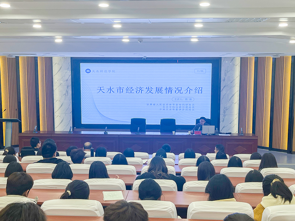 陈葆作题为《天水经济发展情况介绍》的报告,分别从天水基本市情、主要发展成就、面临困难挑战、发展战略定位、今后发展重点和需要关注课题等6个方面作了汇报。学院师生更加全面深入地认识和了解了天水市情,为今后更好地服务区域经济和社会发展开拓了新思路。