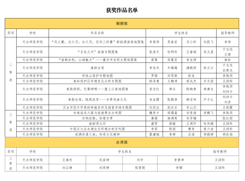 tyc8722太阳集团城组织47支队伍参加了地图制图组比赛,3支队伍参加了应用组比赛。经过专家评审,学院获得地图制图组二等奖9项,三等奖5项;应用组获得三等奖2项;天水师范学院获优秀组织奖。