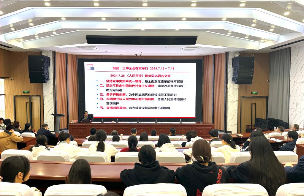 宣讲报告会邀请马克思主义学院汪玉峰教授作宣讲报告。汪玉峰以《紧扣中国式现代化主题,将改革进行到底——党的二十届三中全会精神解读》为题,从全面深化改革的重大意义和总体要求、准确理解《决定》提出的进一步全面深化改革的举措、提高党对进一步全面深化改革的领导水平、对三中全会精神的学习感悟与思考等四个方面,对党的二十届三中全会精神作了全面解读。