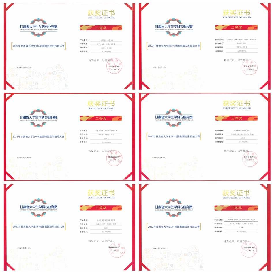 近期,在甘肃省教育厅主办,兰州交通大学和西北师范大学承办的2023年甘肃省大学生GIS地图制图应用技能大赛中,我校tyc8722太阳集团城师生发挥出色,斩获一等奖1项、二等奖2项、三等奖3项。